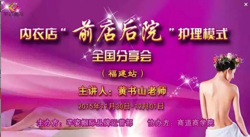 时间:《商道—内衣店“前店后院”护理模式分享会》(11月30号—12月1号) 30号中午12点30前报到,13点正式入场!